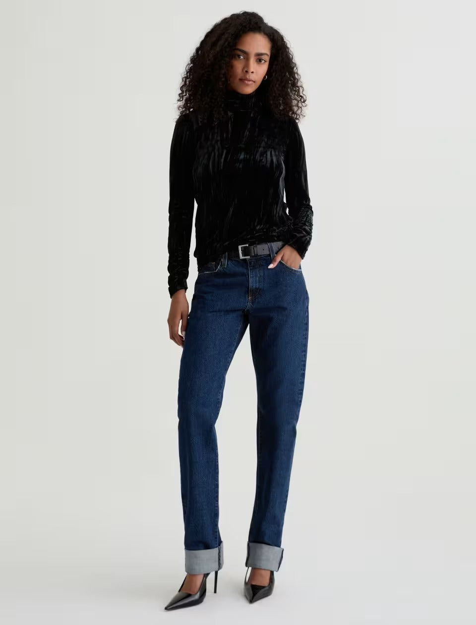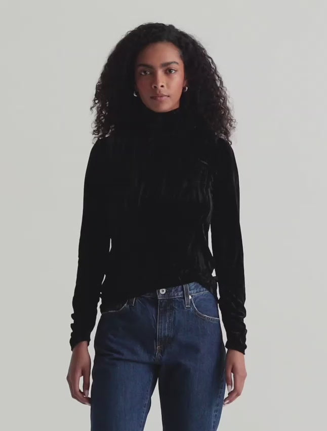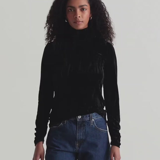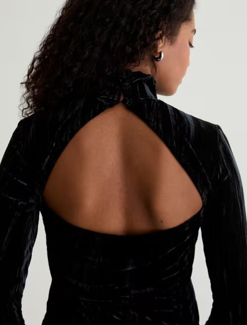 The Candice Velvet is an open back turtleneck. This wardrobe must-have is crafted from Liquid Velvet, a black crushed velvet that drapes beautifully on the body, featuring ruched long sleeves, turtleneck with a button closure at the center-back neckline, and an open back design.