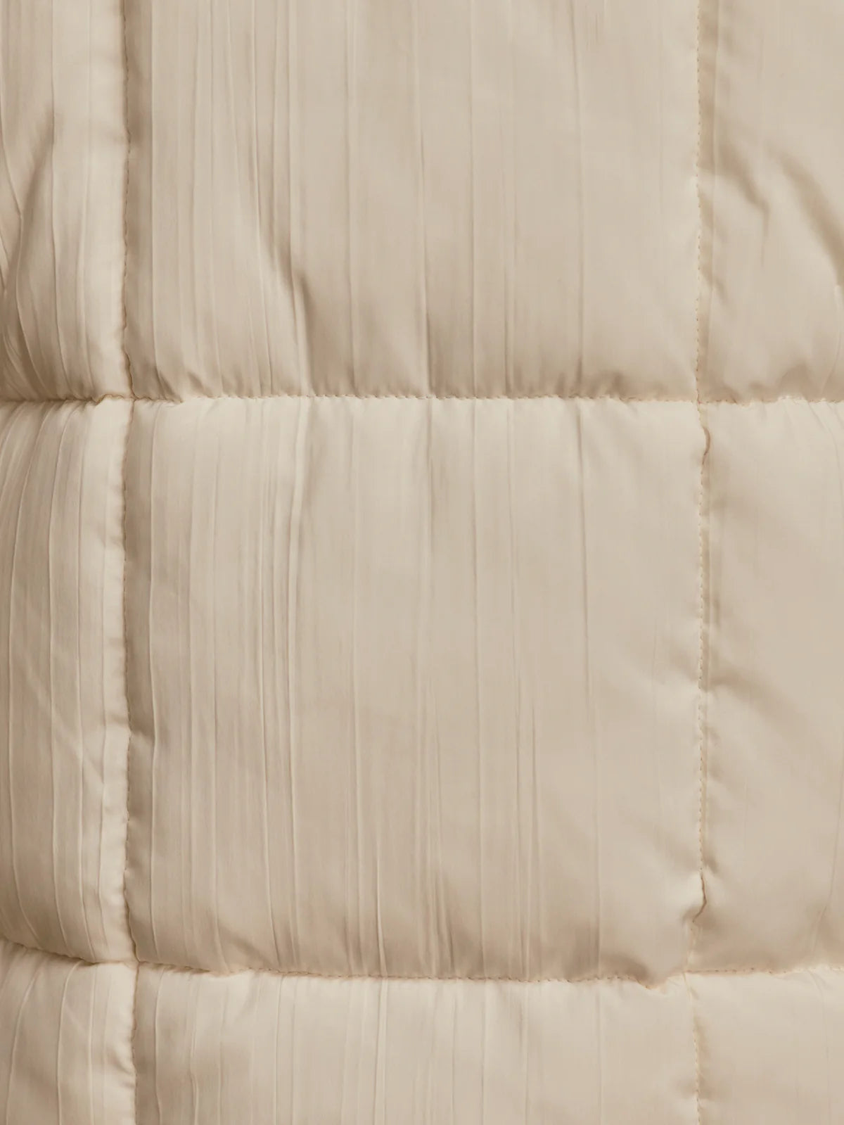 An elegant layering essential designed to be worn over knits or sweaters, the Chiara is defined by its clean, lightweight design with a plissé texture and a large, pillow-like collar. Cut to a contemporary shape with a wrap front and minimal snap fastening for the collar, this gilet is accentuated with square quilting and angled welt pockets with a fleece lining.