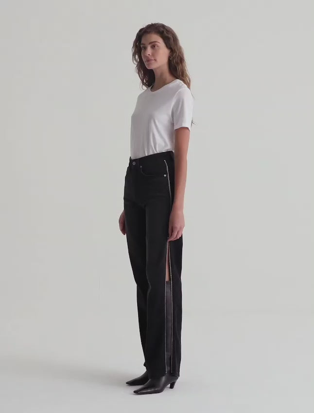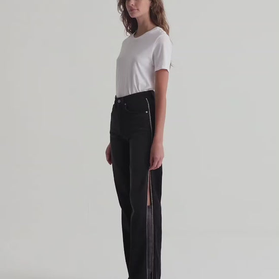 A moto update to our Kora wide-leg jeans. Exposed zippers detail the side seams, so you can adjust the fit with deep side slits. This high-rise pair comes in 11.25 oz. Organic Black Rigid denim, a non-stretch Italian denim made with a blend of recycled and organic cottons.