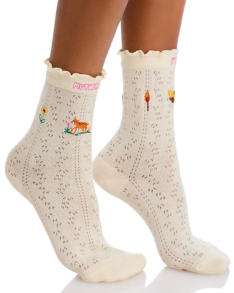 From cab to cabin. Tube socks with a message from MOTHER. Shown here in white with colorful embroidery throughout.